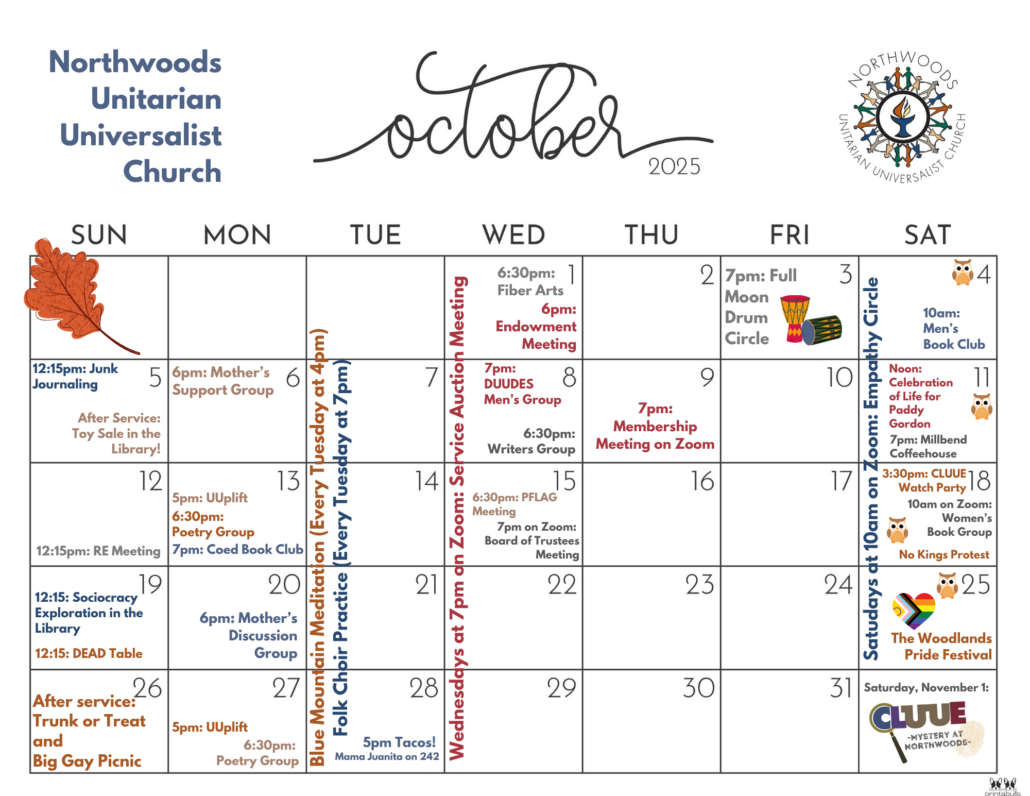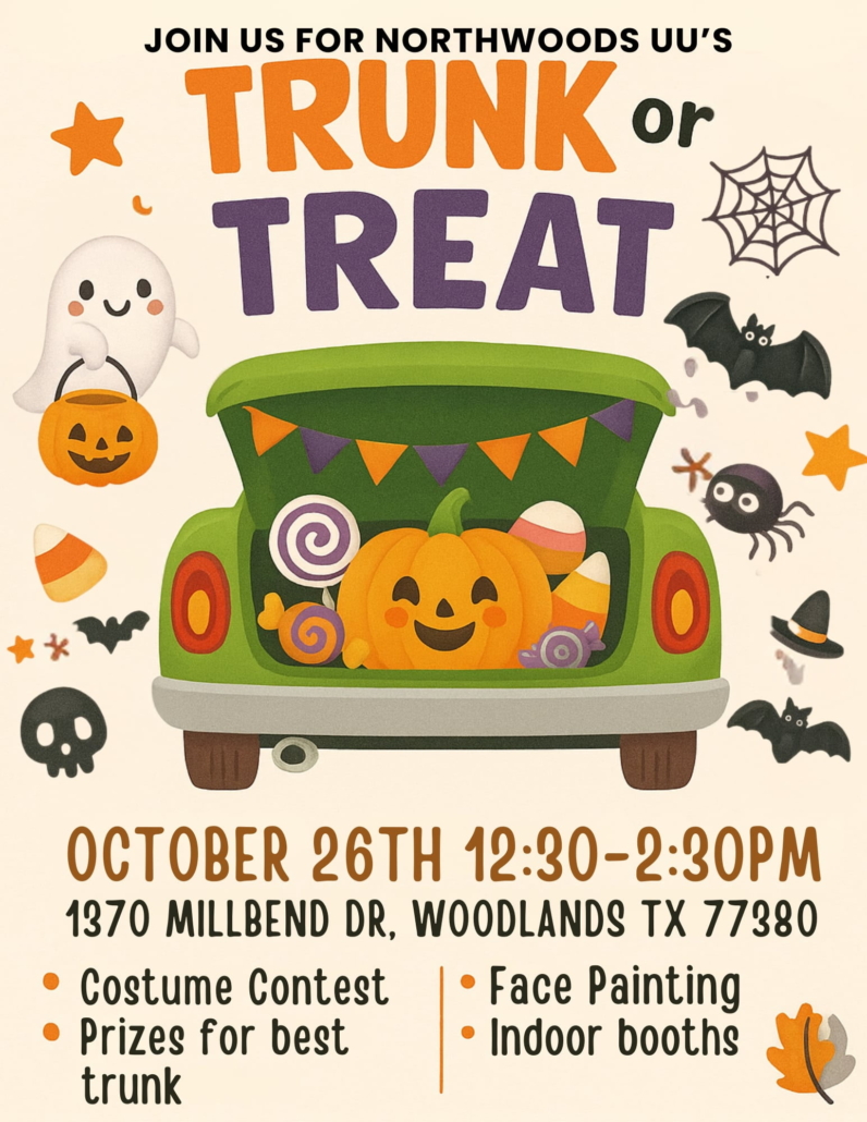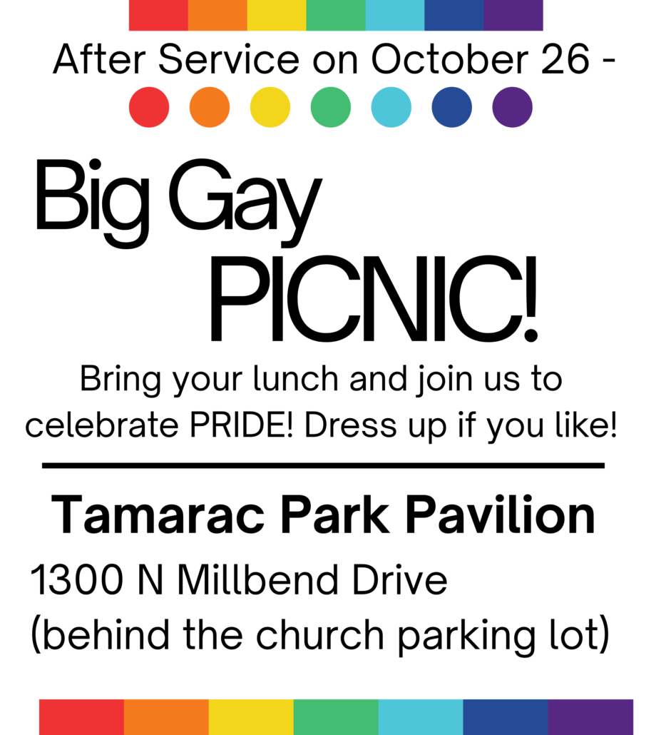 - Big Gay Picnic at Tamarac Park – October 26: Join us for a picnic celebrating pride and community during The Woodlands Pride weekend at Northwoods UU! Bring a picnic and a chair!