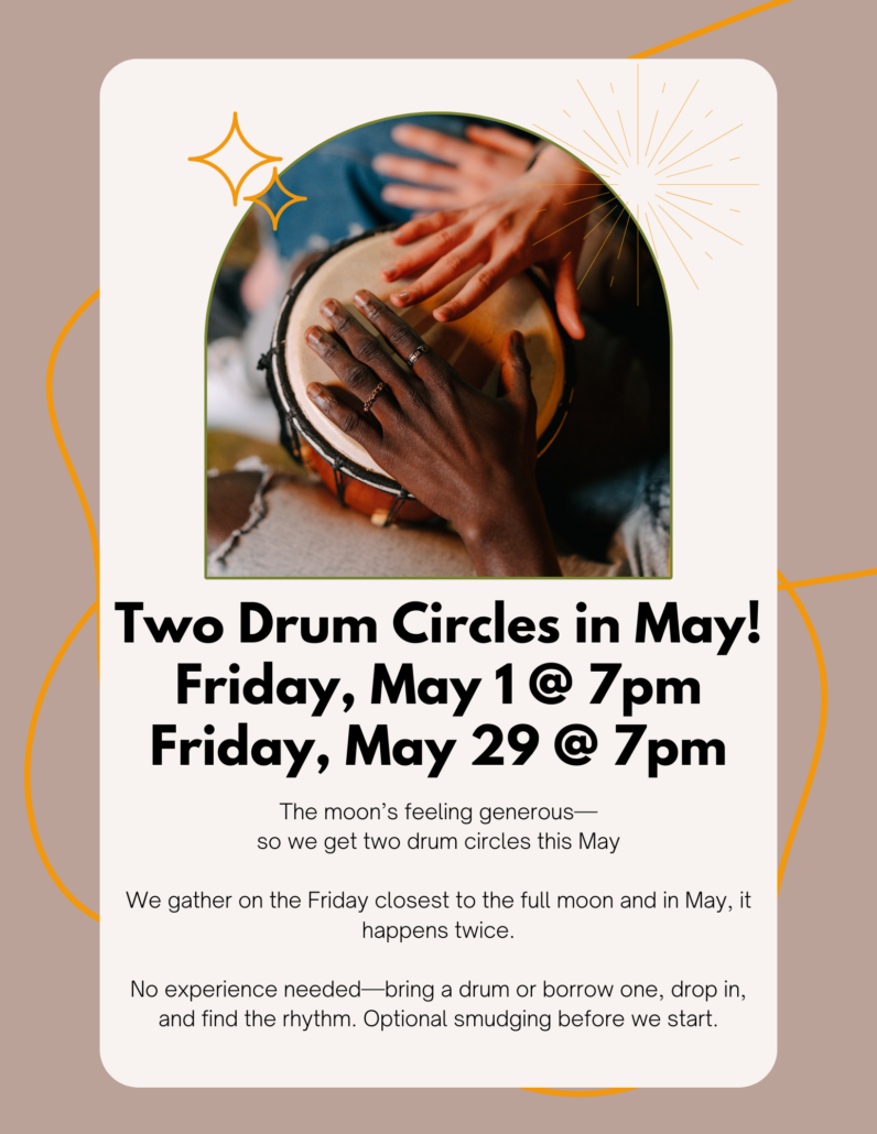 Northwoods hosts a Full Moon Drum Circle on the Friday closest to the full moon at 7pm with optional smudging beforehand for those who want to open spiritual space for yourself. Children are expected to participate in drumming as the adults are doing. All levels of experience welcome. Bring a drum if you have one or borrow from the community collection.